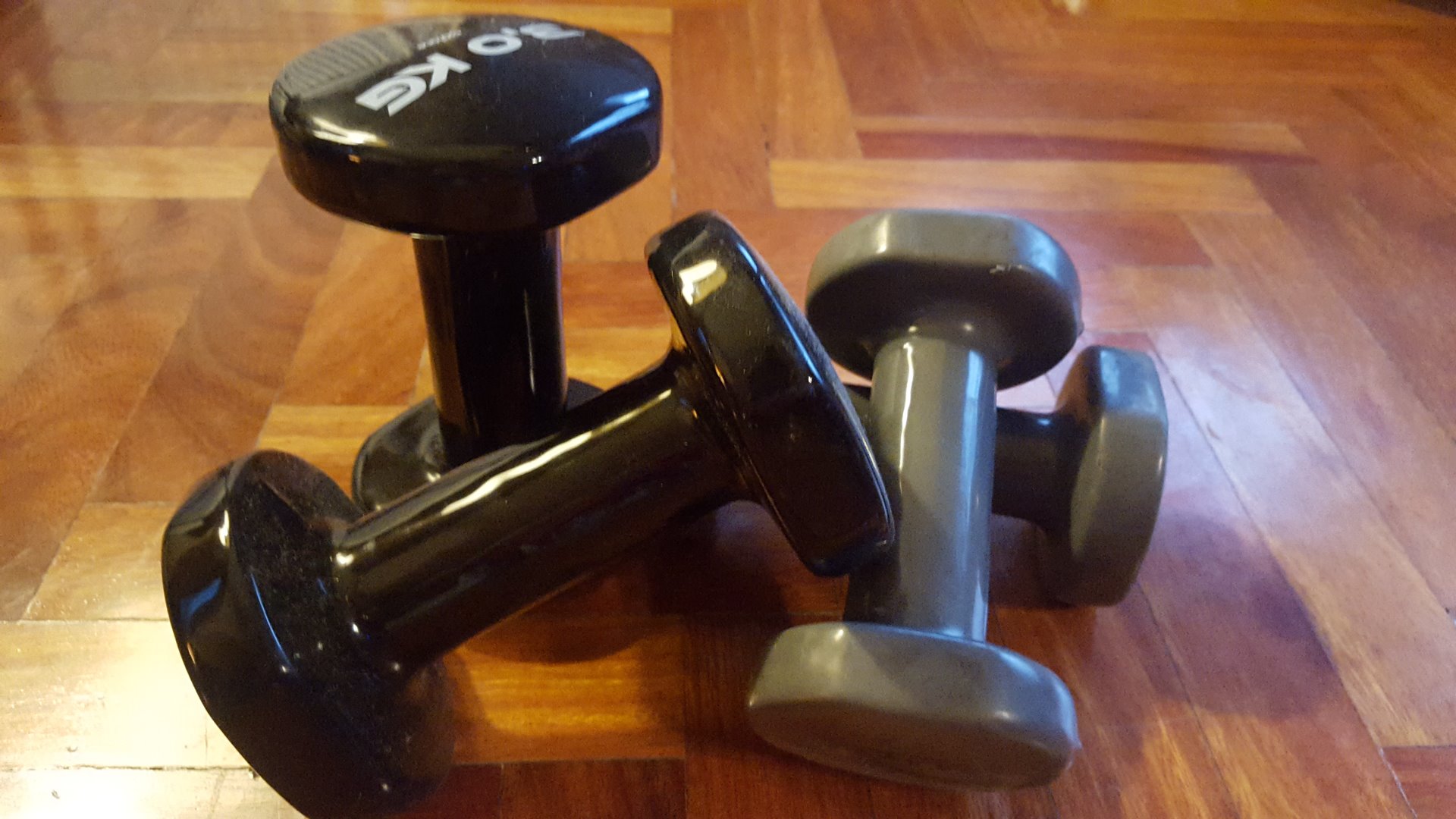 Mi primera adquisición fueron unas mancuernas, dos de 2 kgs y dos de 3 kgs. En un principio usaba las de dos kilos, luego pasé a las de 5 y ahora cojo las cuatro repartidas en las dos manos y así me hago a la idea de que trabajo con 5 kilos. Y eso si no me da por atarlas con los lastres de dos kilos y medio que también me compré. En las mancuernas me gasté, en las cuatro, unos 35 euros. Hay una opción más barata que puedes encontrar en decathlon. El Kit de Mancuernas Musculación 10 kg DOMYOS (cod. 1042451). Cada mancuerna cuesta 12,99 € y puedes poner el peso que tú quieras, porque viene con cuatro discos de 1 kilo y dos discos de dos kilos, que junto con la barra, que ya pesa otros dos kilos, puedes montarte tu peso más adecuado.